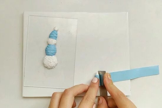 2. Használjunk fehér FIMO gyurmát és készítsünk sapkát a hóemberünknek. Nyújtsunk ki egy hosszú, vékony lapot a FIMO pasztellvíz színű gyurmából. Helyezzük a középső golyóra, ez lesz a hóemberünk pulóvere. Nyomjuk rá, majd a vágjuk körbe a FIMO vágókés készlettel.